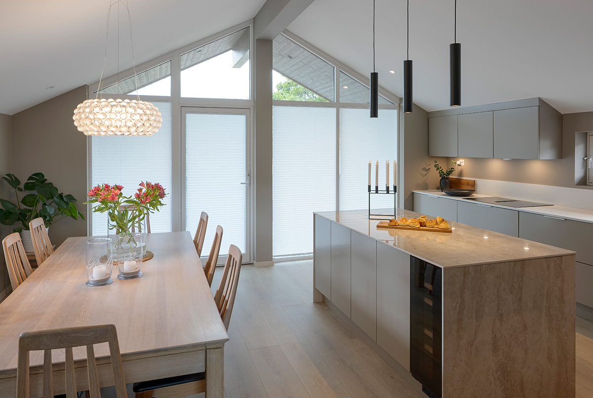 – Det viktigste var å tilpasse boligen til egne behov. Løsningene må fungere i praksis, sier hun. Kjøkkenet og spiseplassen har blitt husets hjerte.