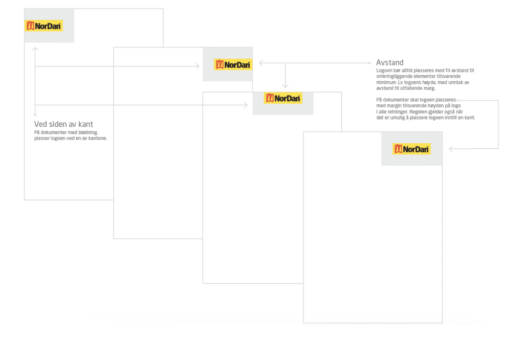 Det skal alltid være et beskyttet område rundt NorDan logoer. Det betyr at ingen elementer, illustrasjoner, tekst eller andre linjer må plasseres i det beskyttede området. Logoen skal ved normal bruk plasseres på en visuelt ren overflate, uten distraherende eller forstyrrende elementer som tekst, grafikk eller bilder. Det er definert et beskyttet område på alle sider.