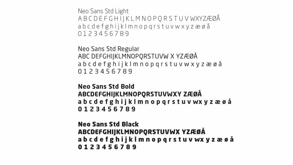 En felles skrifttype skal tjene som en visuell indikator. Neo Sans av Monotype Foundry er vårt skrifttype, og brukes i all markedsføring. Neo Sans kan være ganske vanskelig å jobbe med uten tilgang til typo- grafiske verktøy, for eksempel Adobe InDesign, Illustrator eller Photoshop. Som en tommelfingerregel bør du ikke bruke Neo Sans hvis du ikke har tilgang til denne typen programvare.